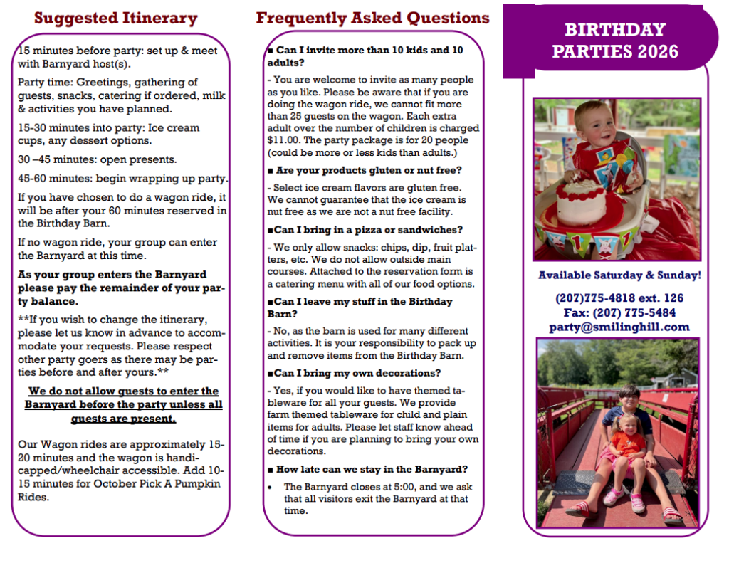 Make your next birthday party special. Consider letting Smiling Hill Farm host your celebration.